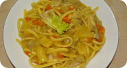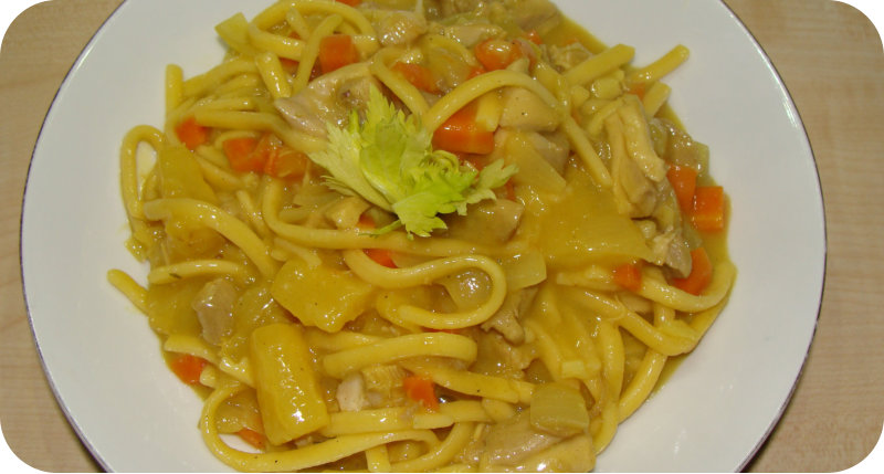 Ik had een kg kippedijen in de koelkast, wat moet je ermee, lekker grillen is een mogelijkheid, stoven is naturlijk lekker bv cock au vin. Ik had ook in de koelkast een ananas en dan ontstaat het idee van een kip, kerrie met ananas. Al een tijd niet gegeten dus een verdomd goed idee. Dus dijen ontbenen, want ik heb het niet zo op kluiven, al is het maar 1 botje, hij gaat eruit. Het velletje weg, maar die botjes in een zakje in de vriezer, bewaren voor een bouillon, weggooien is zonde. Geen rijst in huis dus dan maar wat spätzle erbij, gaat die zak ook een keertje op. 1 kg kip dijen (ontbeend) 3 uien schoongemaakt en in blokken wortel geschild en in blokken 3 tenen knoflook grof gehakt 1 ananas geschild en in grote blokken kerrie natuurlijk bloem zout en peper halve liter bouillon olie in de pan en de kip stukken braden. Dan de ui, wortel en knoflook erbij. eetlepel kerrie erbij en goed verhitten voor mooie kleur en smaak. Dan de blokken ananas erbij. Eetlepel bloem erbij voor de binding. En dan de bouillon en rustiog laten pruttelen, roer regelmatig want voor je het weet heb je een bodem en dat is niet alleen zonde voor de smaak ook weer extra werk. Op smaak brengen natuurlijk.